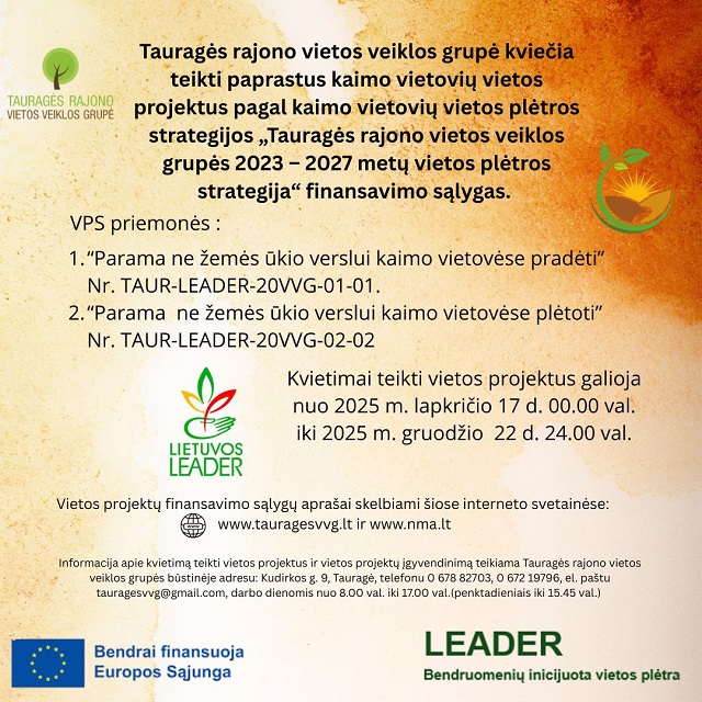 Tauragės rajono vietos veiklos grupė kviečia teikti paprastus kaimo vietovių vietos projektus pagal kaimo vietovių vietos plėtros strategijos „Tauragės rajono vietos veiklos grupės 2016 – 2023 metų vietos plėtros strategija“ (toliau – VPS) prioriteto Nr. 1 “Ekonominio gyvybingumo kaimo vietovėse skatinimas” priemonę „Ūkio ir verslo plėtra“ Nr. LEADER-19.2-6 veiklos sritis „Parama ne žemės ūkio verslui kaimo vietovėse pradėti“ Nr. LEADER-19.2-6.2 finansavimo sąlygas.