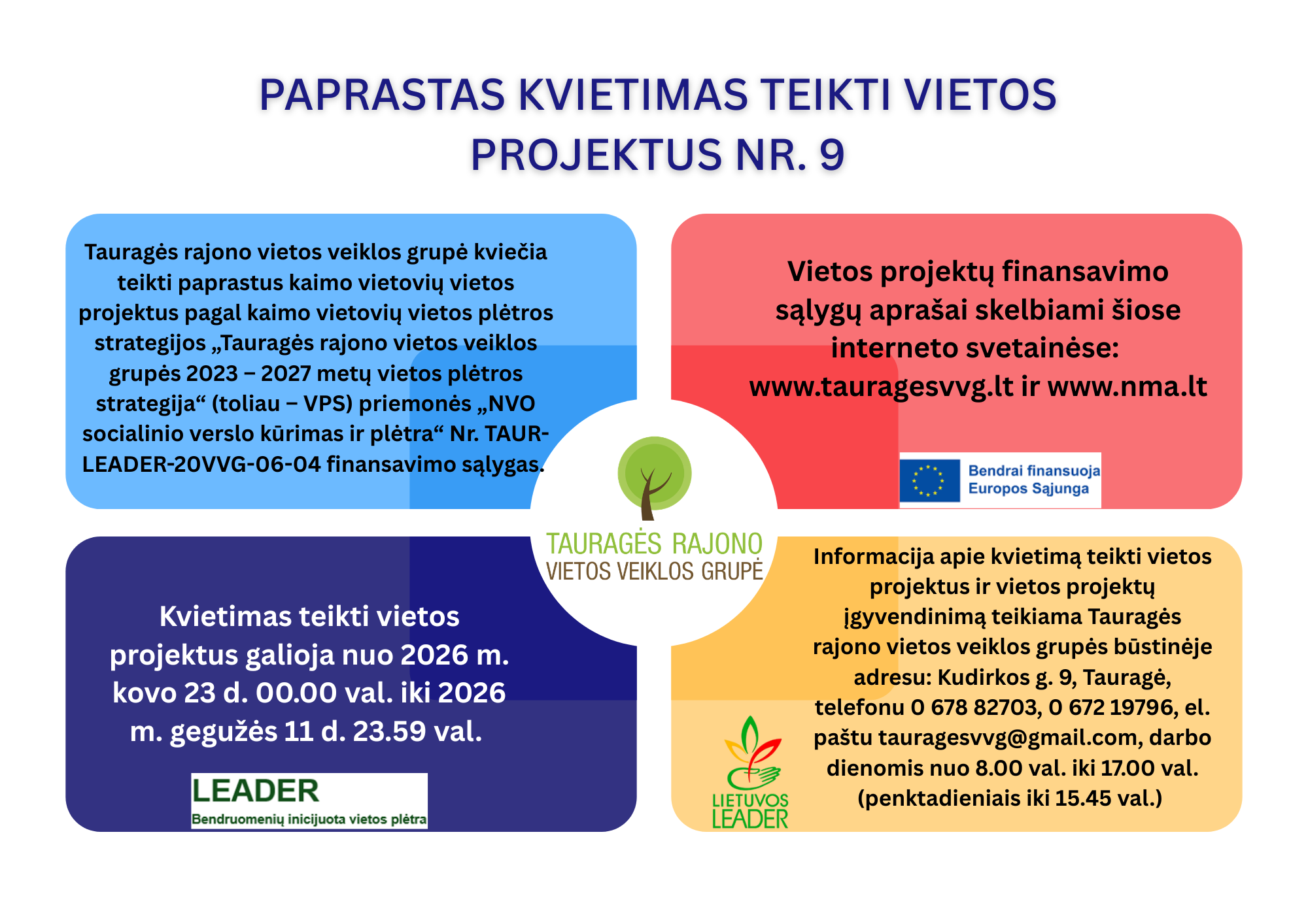Vietos projektų finansavimo sąlygų aprašai skelbiami šiose interneto svetainėse: www.tauragesvvg.lt ir www.nma.lt, taip pat Tauragės rajono vietos veiklos grupės būstinėje adresu Kudirkos g. 9, Tauragė.